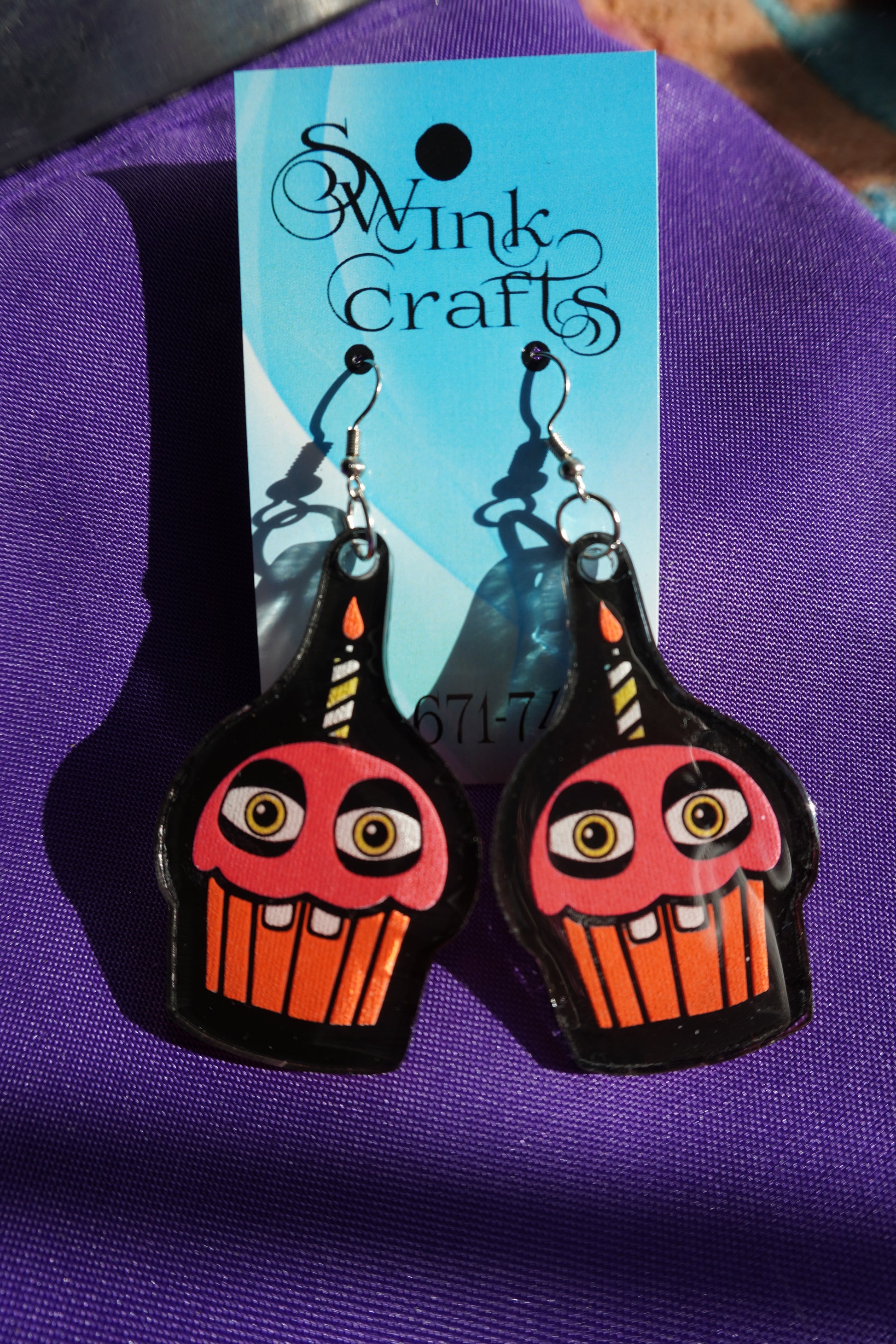 Mr. Cupcake earrings from Five Nights at Freddy's. Colors react to black light!